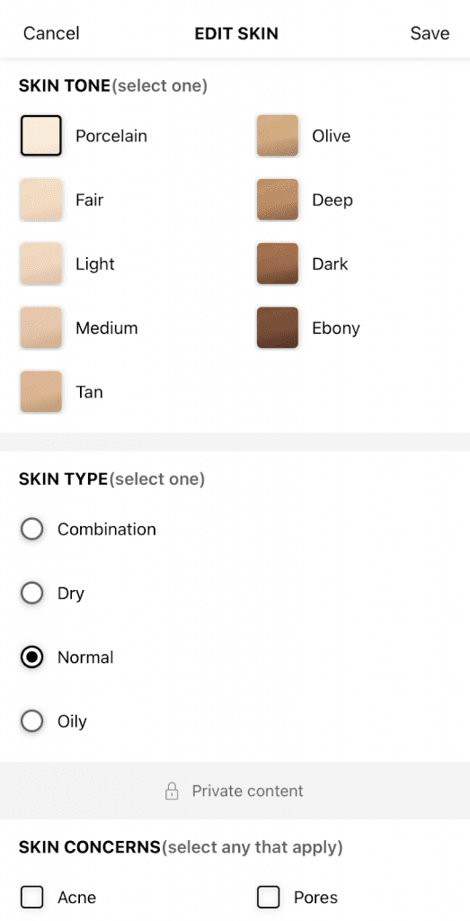 The “Color IQ & Beauty Traits” section lets the visitor create a detailed customer profile. They can give information like skin tone, hair and eye color, and any other important details.