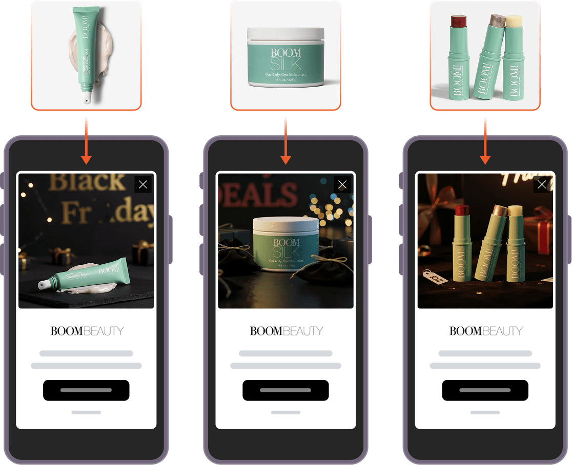 Transform your plain beauty product shots into striking Black Friday visuals that spotlight tailored offers.