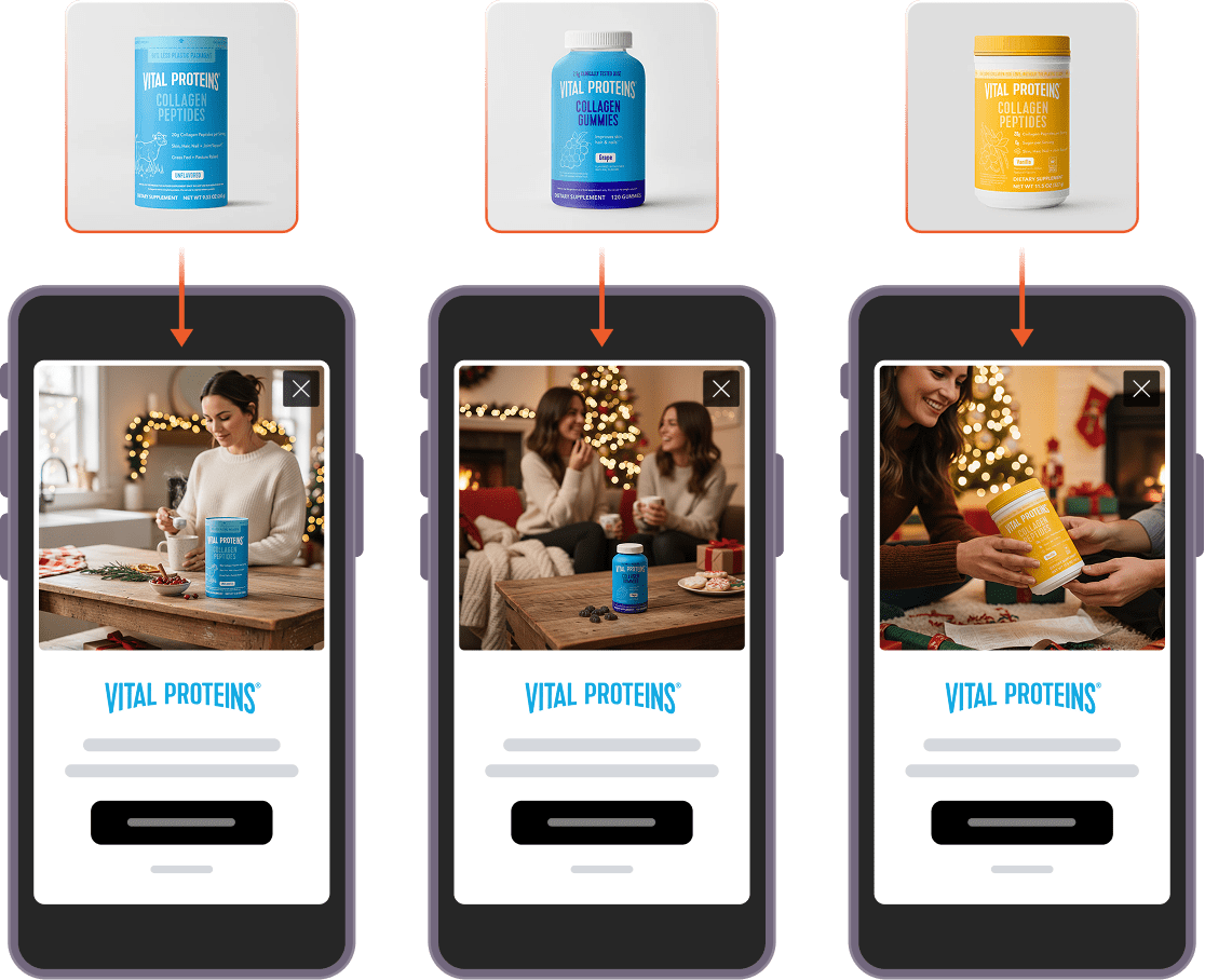 Your everyday health product shots get a festive AI touch, creating personalized Christmas popups.