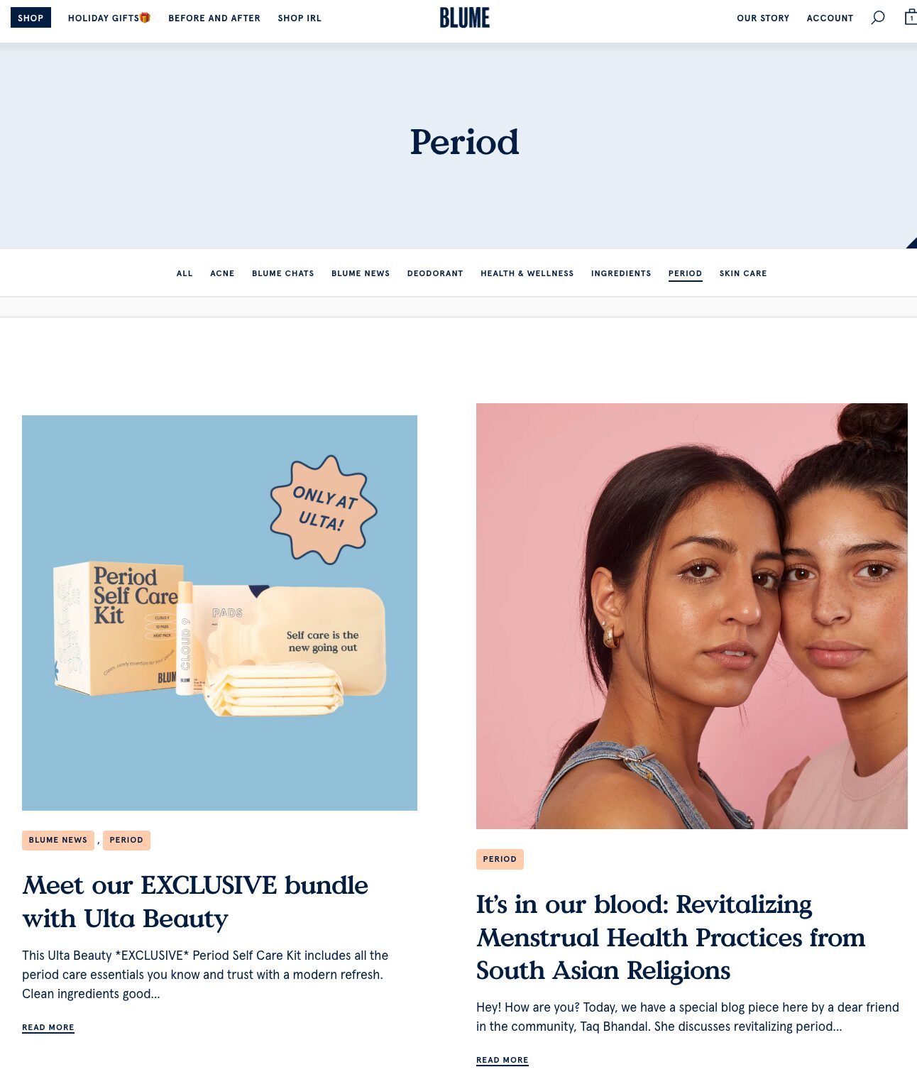 Instead of filtering by product type, Blume organizes the experience around what the user actually needs, creating a stronger sense of personalization.