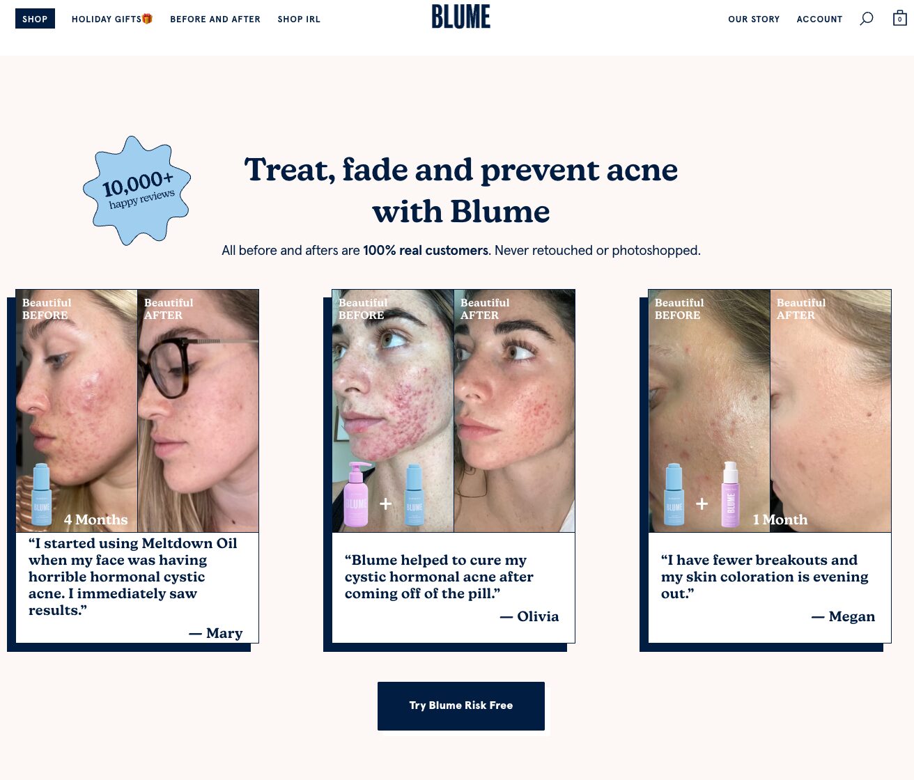 Real customers. Real skin. No filters. Blume consistently features unedited user-generated content to showcase real results and build credibility.