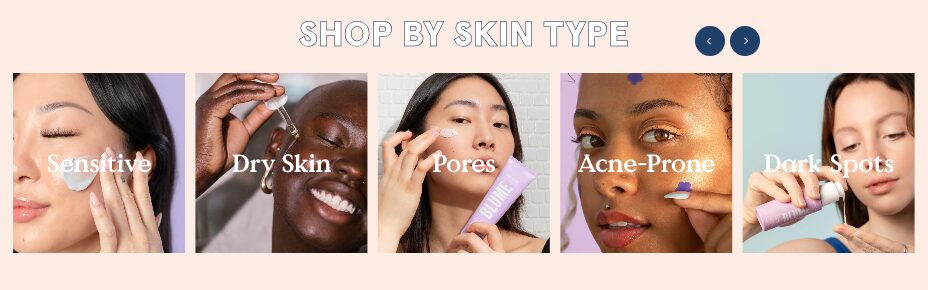 Users can shop by skin concern, from sensitive skin to acne, dryness, or discoloration. This section is highly visual, easy to navigate, and emotionally intuitive.