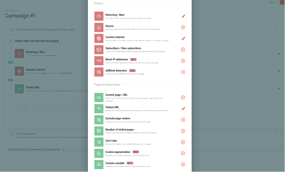 For example, you can show one popup campaign to first-time visitors and another to returning visitors, but you can also customize your campaigns even further using different factors like the source of traffic, geo-location, and browsing history.