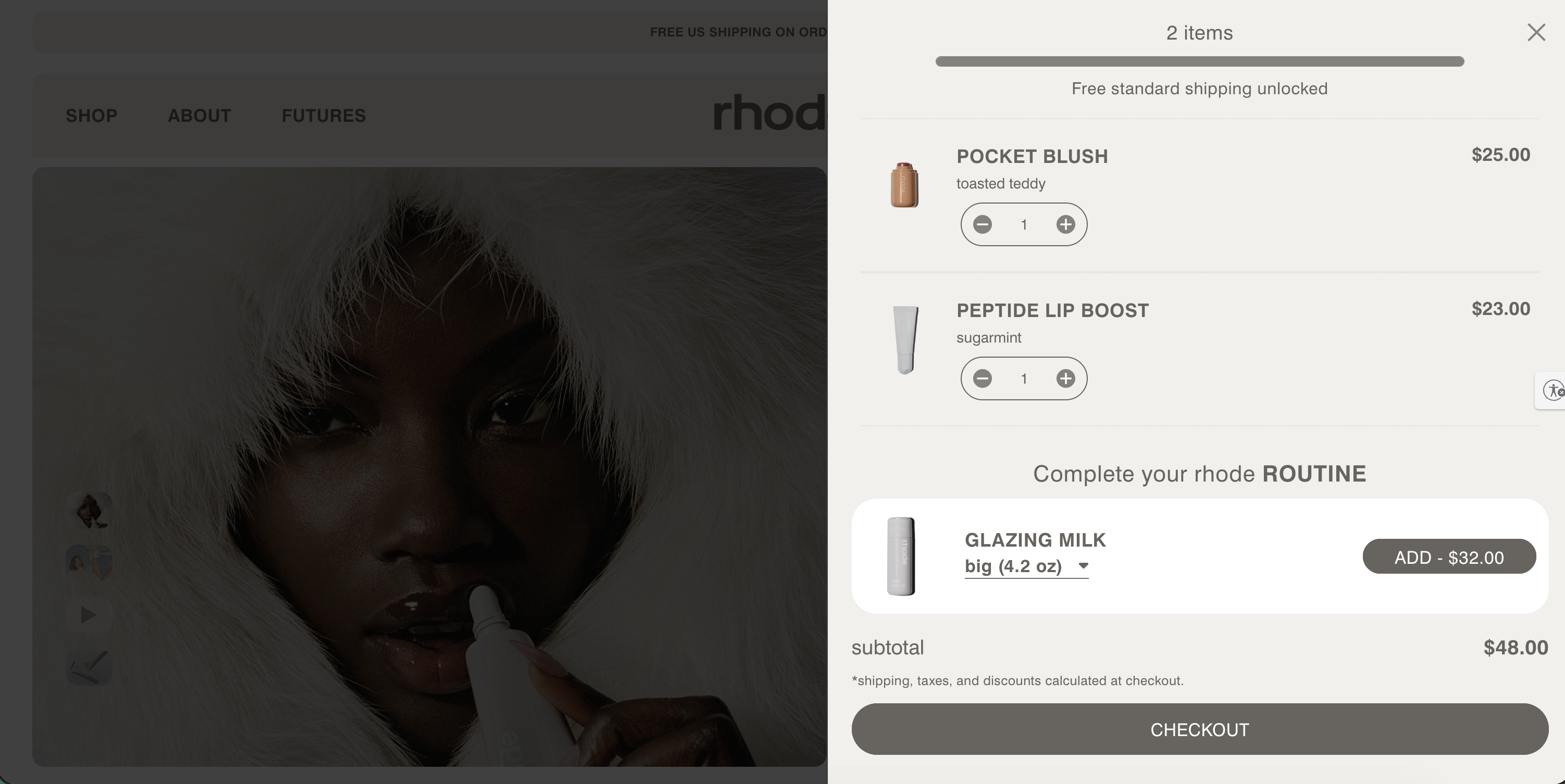 Rhode’s slide-out cart doesn’t just show what you’ve added — it helps customers complete their skincare routine.