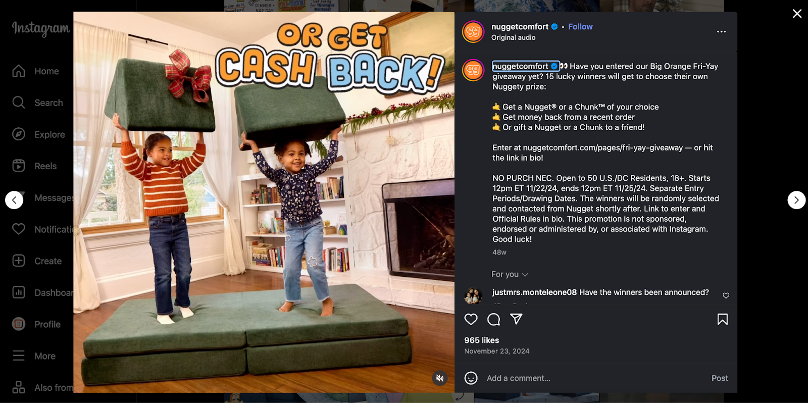 Even on Black Friday—a peak discount moment for most brands—Nugget didn’t lower prices. Instead, they ran a giveaway, offering customers the chance to win a Nugget or Chunk of their choice, refund part of a recent order, or gift a product to a friend.
