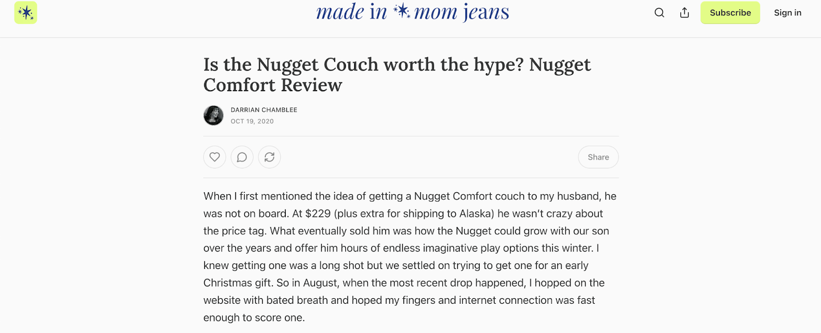 Nugget’s blog isn’t built for traffic. It’s built for their customers. The content is simple, useful, and on-brand—styling tips, gift ideas, play inspiration. It speaks to people who already own a Nugget or are thinking about getting one.