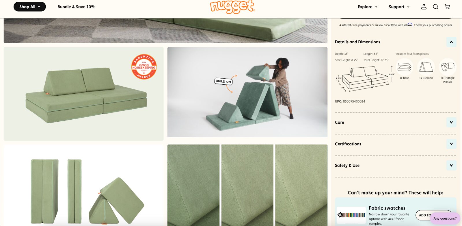For years, Nugget focused on just one product. When they expanded, it was with purpose. Add-ons like the Chunk® Ottoman and swappable covers weren’t just upsells—they made the original product more useful.