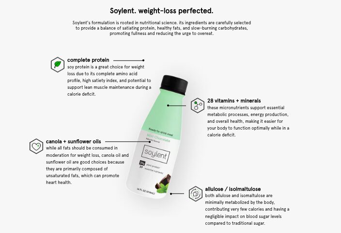 At the bottom, a comparison table places Soylent next to products like Ensure and OWYN. It doesn’t oversell. It shows differences in protein, sugar, and nutritional completeness and lets the reader draw conclusions.