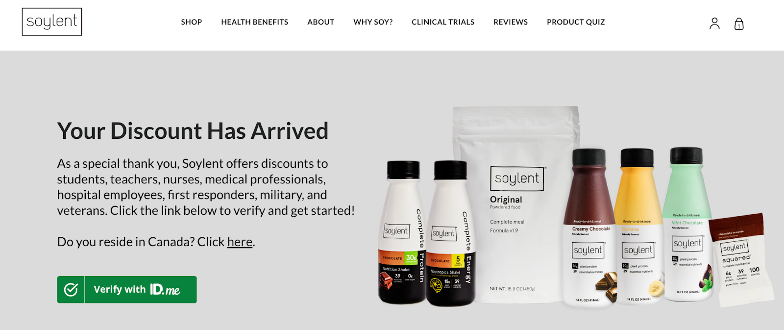 By offering tailored discounts, Soylent builds trust with communities who actually use the product day-to-day and makes it easier for them to keep coming back.