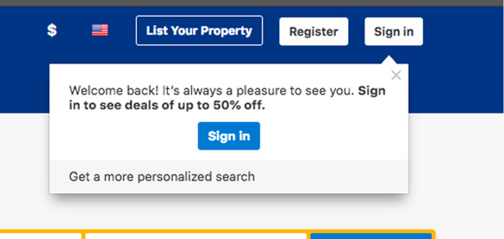 Notice that the goal of this message is to get users to sign into their account, which helps booking.com collect even more data to provide personalized offers and experiences.